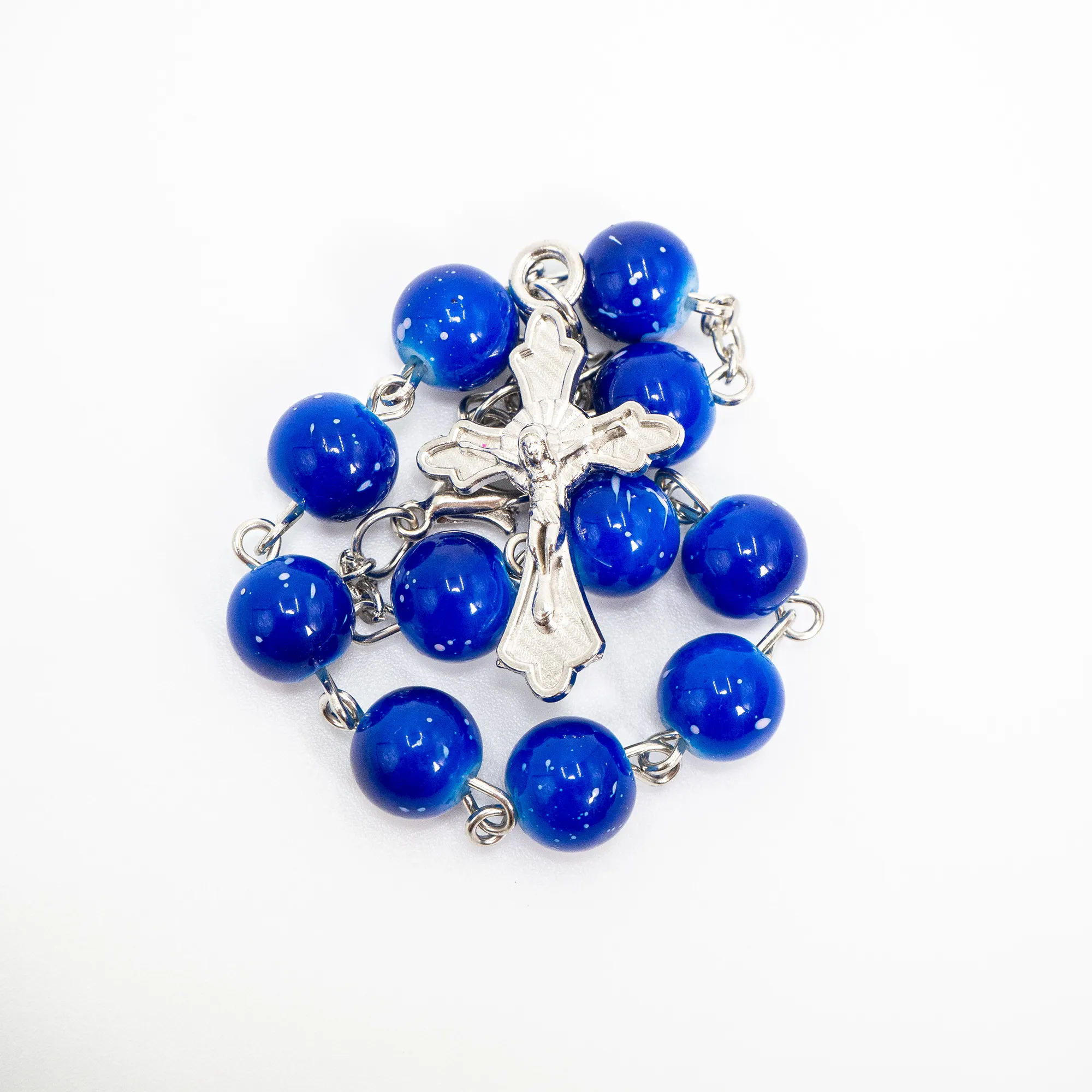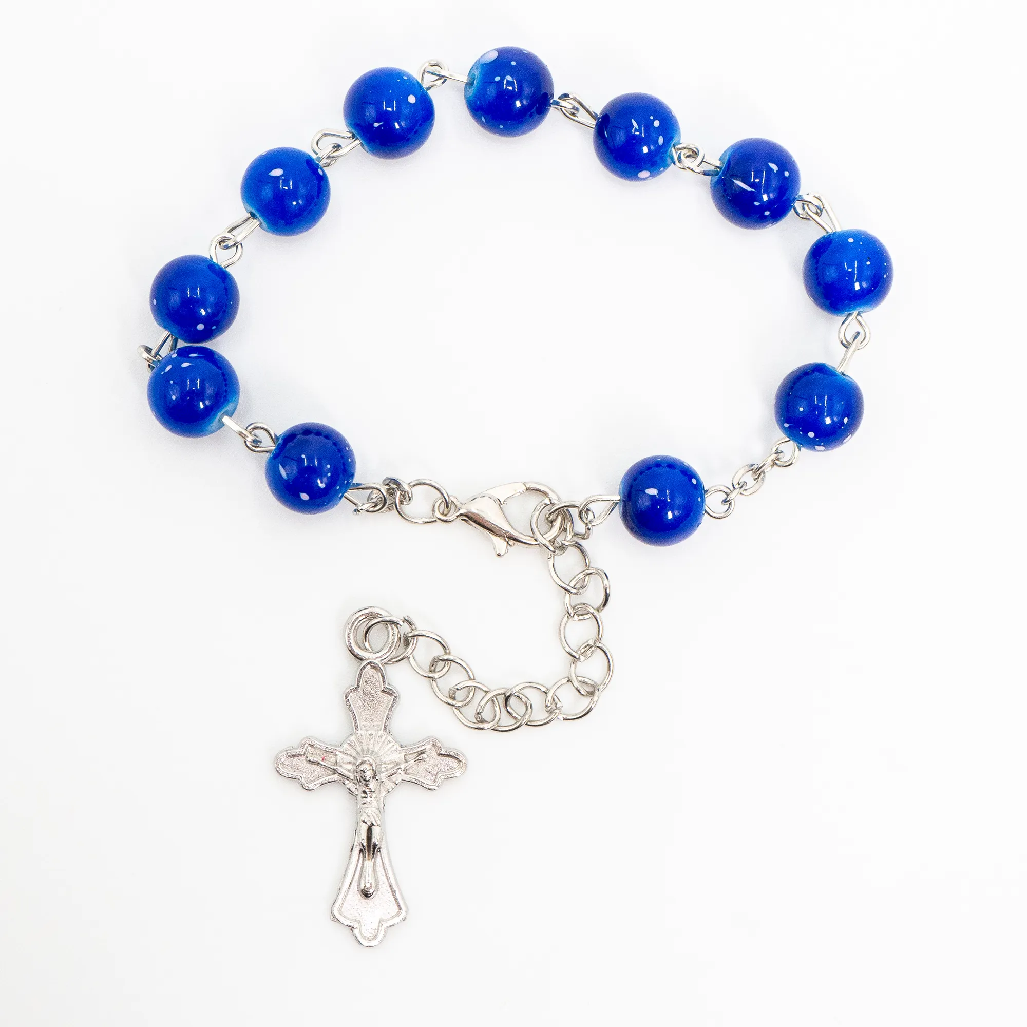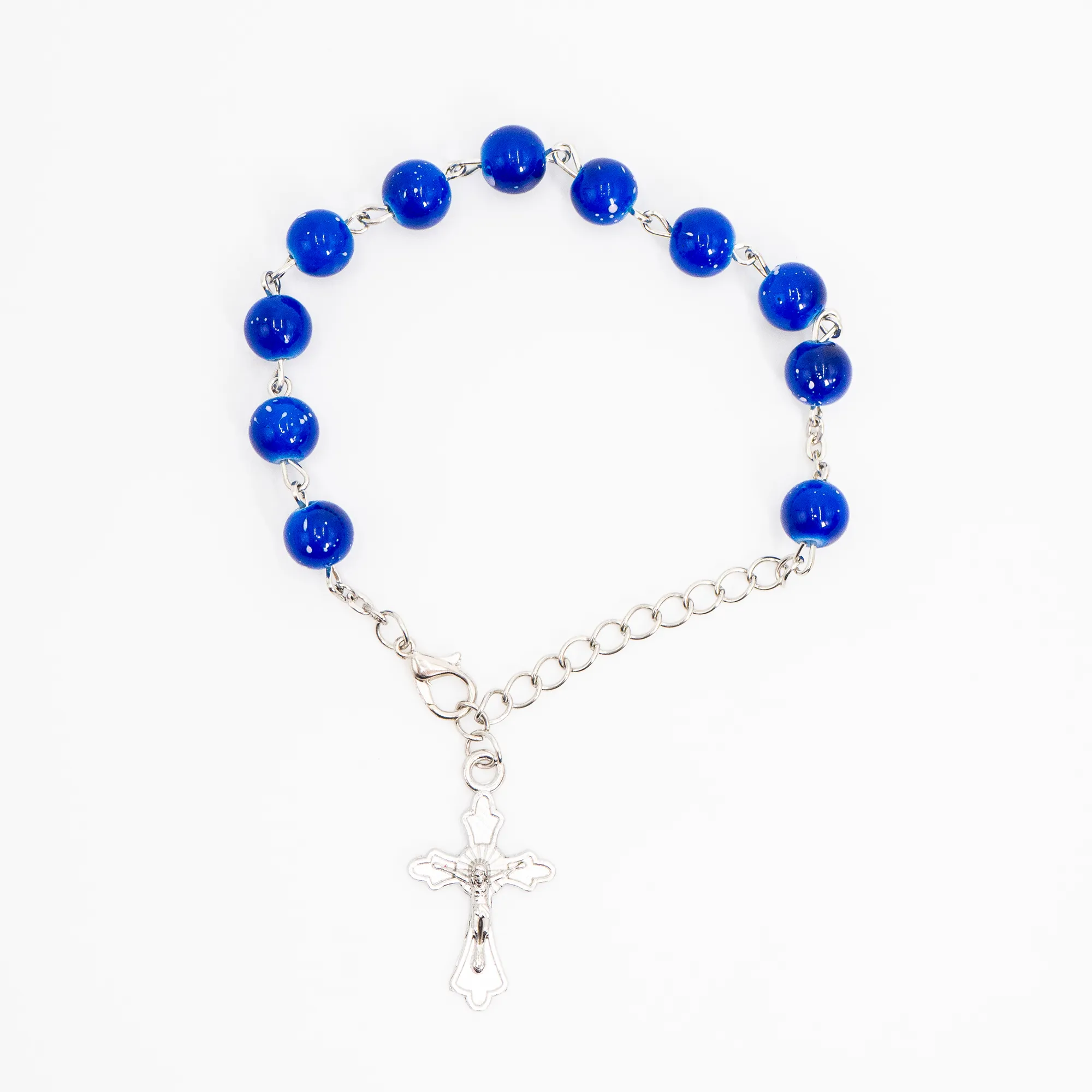 Każdy koralik połączony jest srebrnym łącznikiem, co nadaje bransoletce lekkości i elegancji. Zakończona ozdobnym, krzyżykiem z wizerunkiem Chrystusa oraz regulowanym zapięciem na karabińczyk. Długość bransoletki można dostosować dzięki przedłużającemu łańcuszkowi.