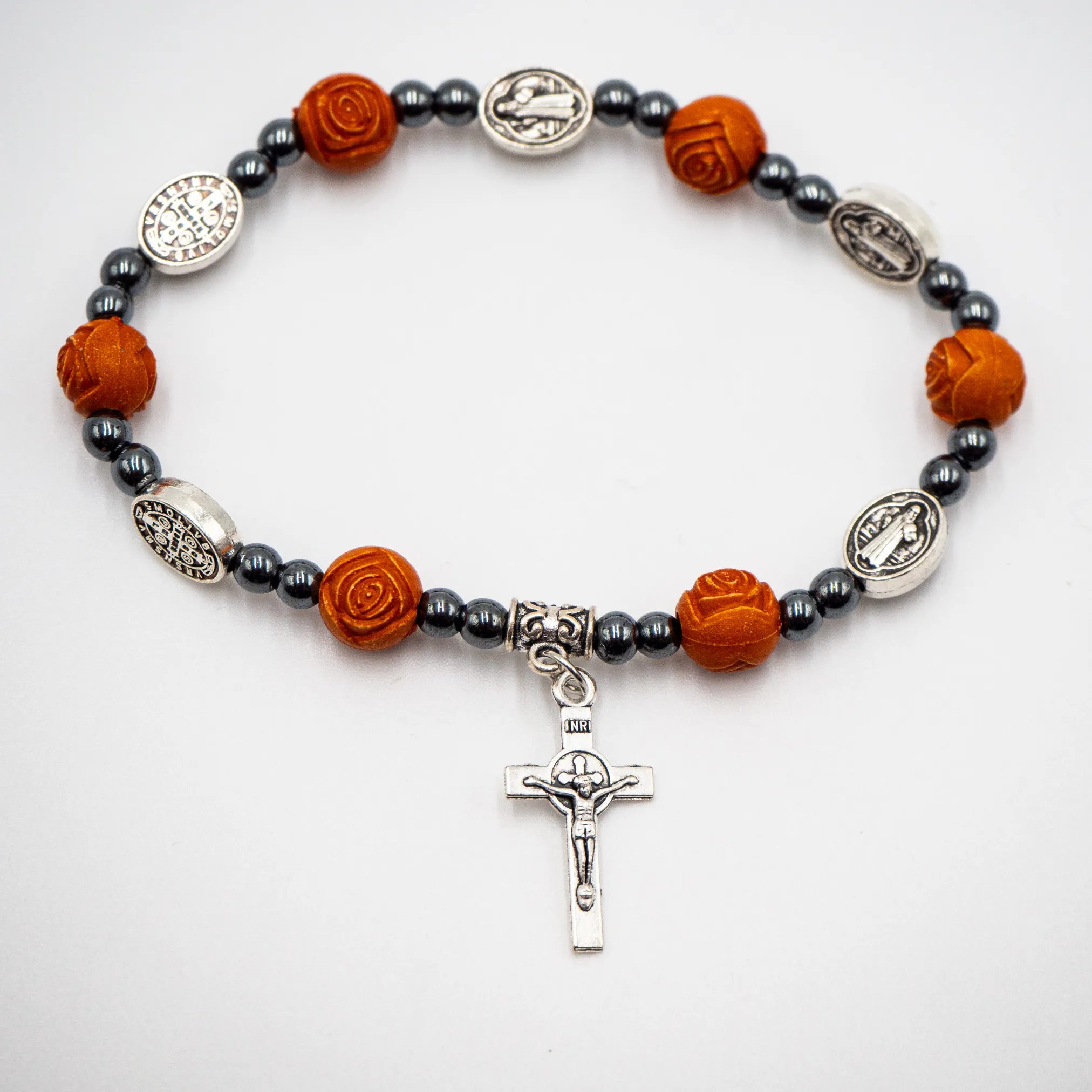 Wykonana z koralików w kształcie róż w ciepłym, pomarańczowo-brązowym odcieniu oraz połyskujących replik medalika św. Benedykta. Idealna jako prezent z okazji uroczystości religijnych lub elegancki, codzienny dodatek o głębokim duchowym znaczeniu.