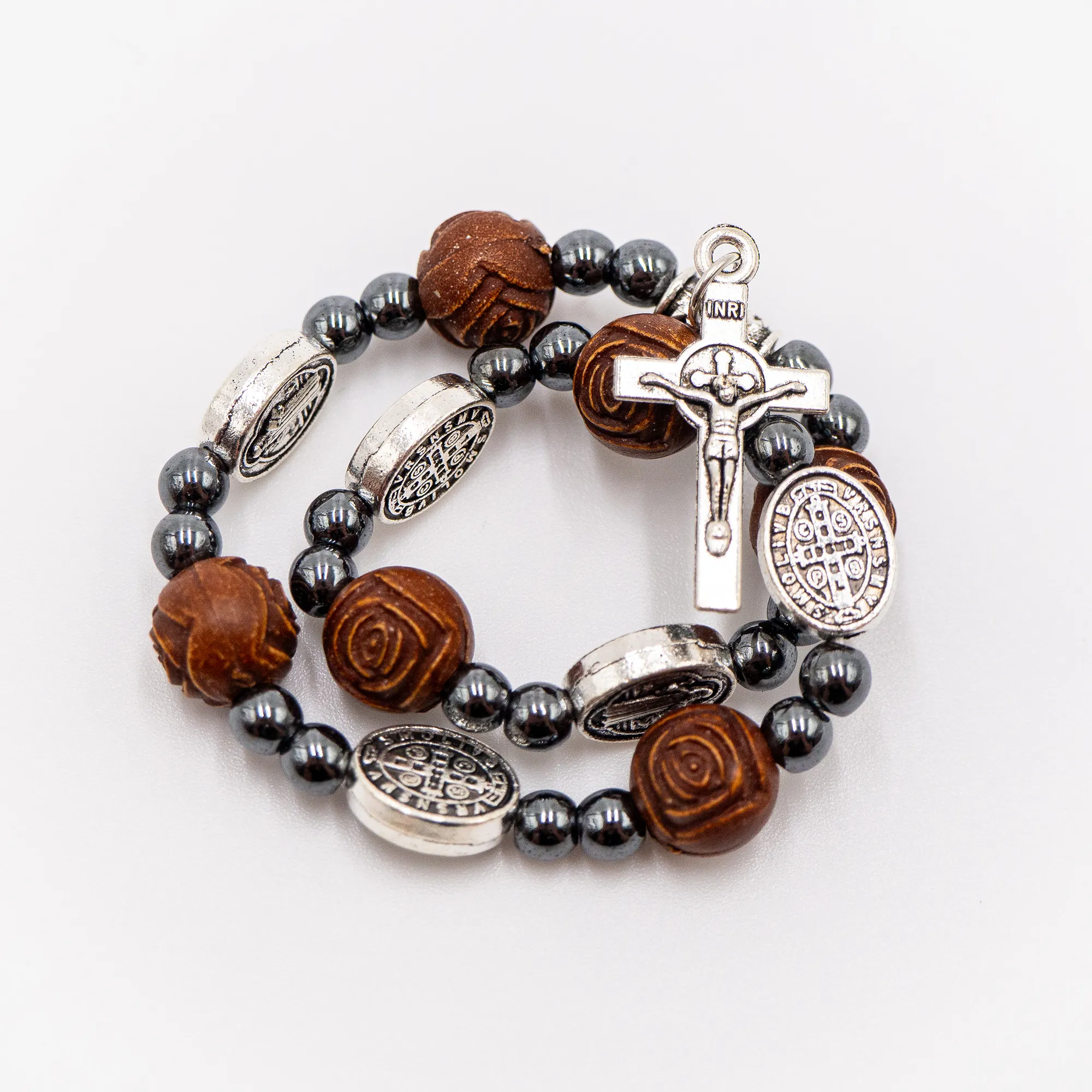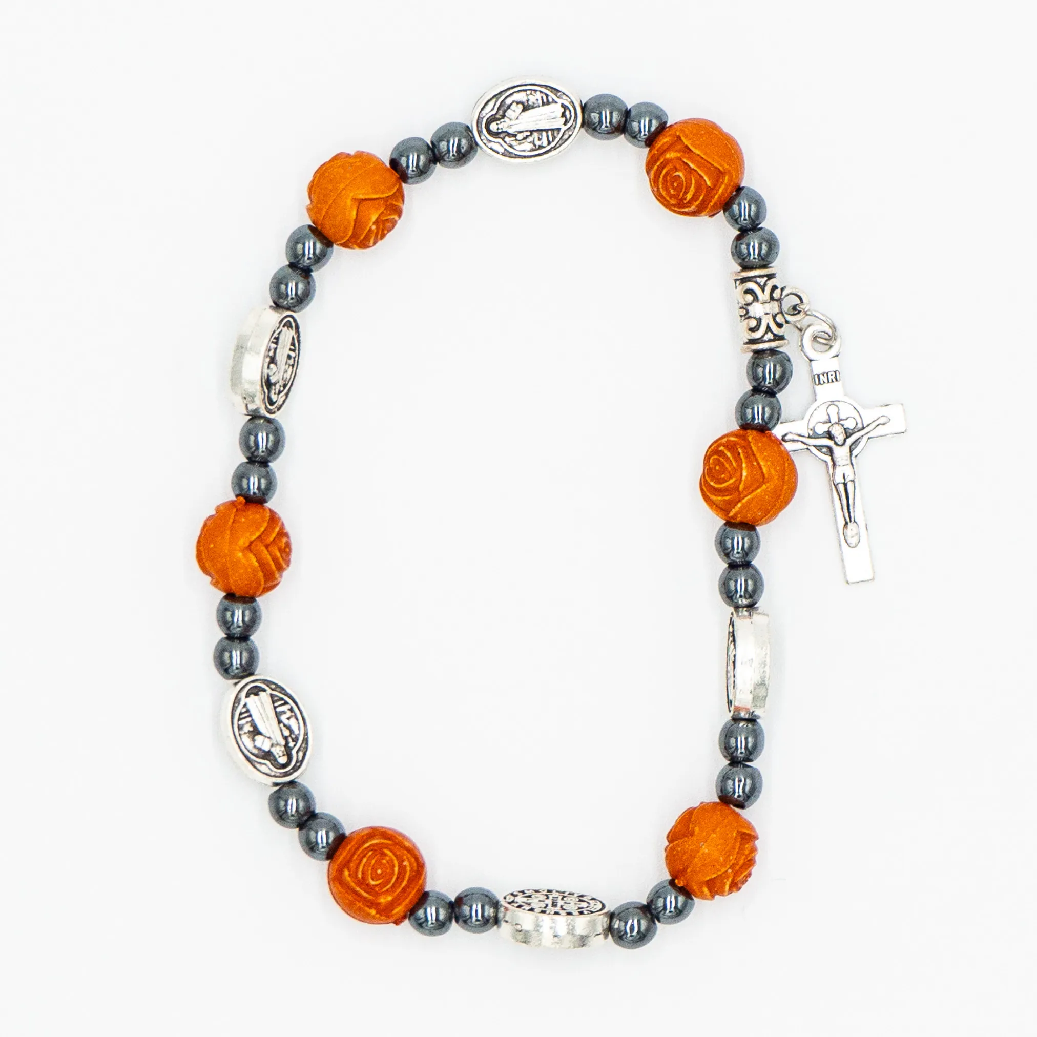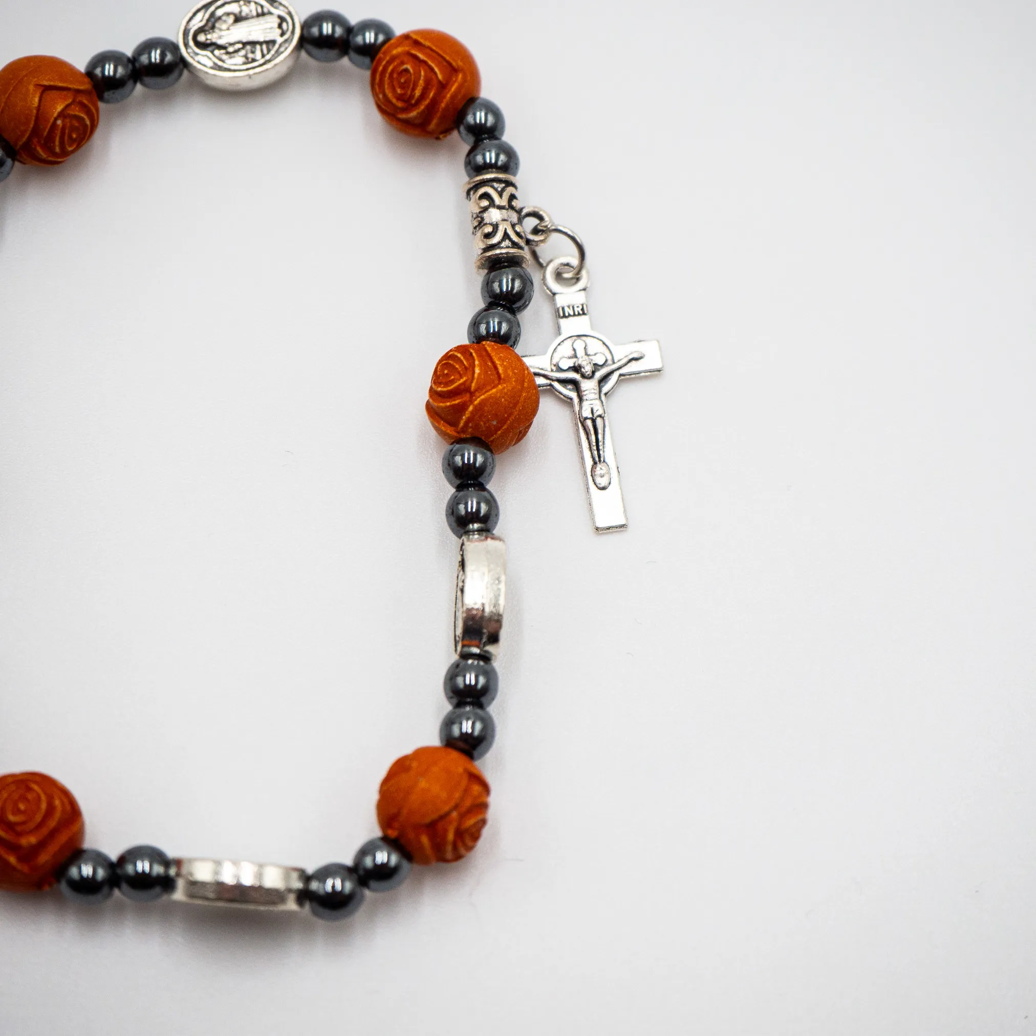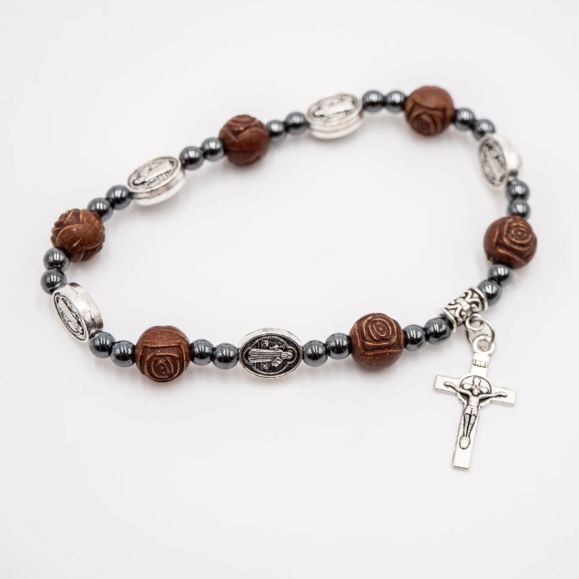 Koraliki w kształcie róż nadają jej romantycznego charakteru, podczas gdy hematytowe koraliki dodają eleganckiego połysku. Połączenie klasycznego wzornictwa z symboliką religijną sprawia, że bransoletka jest nie tylko pięknym elementem biżuterii, ale także pomocą w codziennej modlitwie.