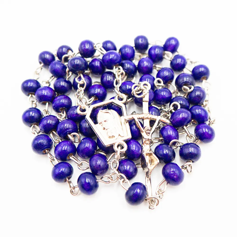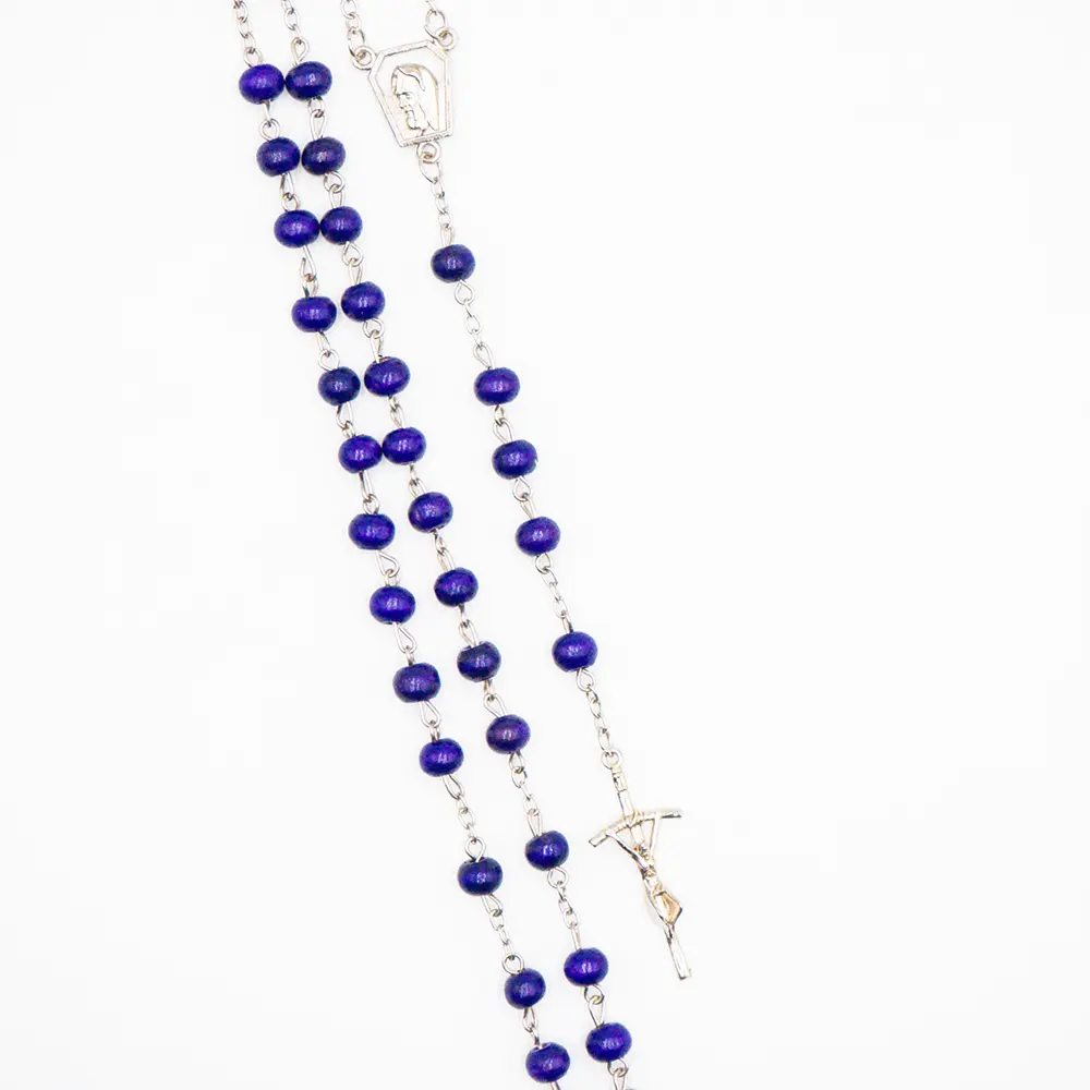 Wyjątkowy różaniec o delikatnym zapachu fiołków, wykonany z drewnianych paciorków w intensywnym fioletowym kolorze. Całość zwieńczona metalowym krzyżem z wizerunkiem Chrystusa oraz łącznikiem z wizerunkiem św. ojca Pio.