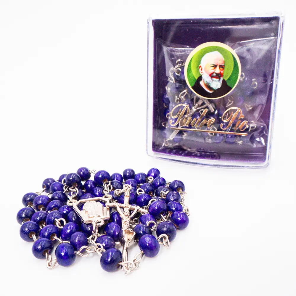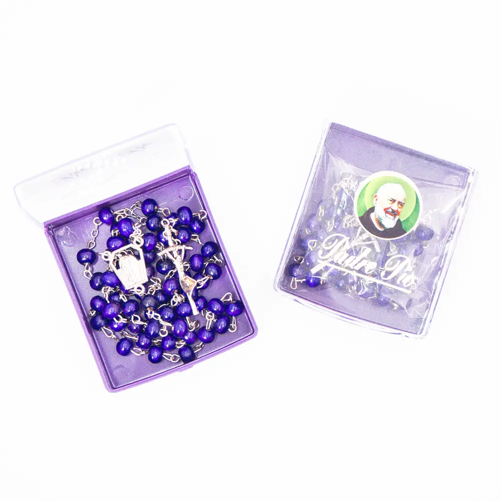 Drewniany różaniec o delikatnym zapachu fiołków w intensywnym fioletowym kolorze z łącznikiem z wizerunkiem św. ojca Pio. W zestawie eleganckie pudełko z wizerunkiem św. ojca Pio.