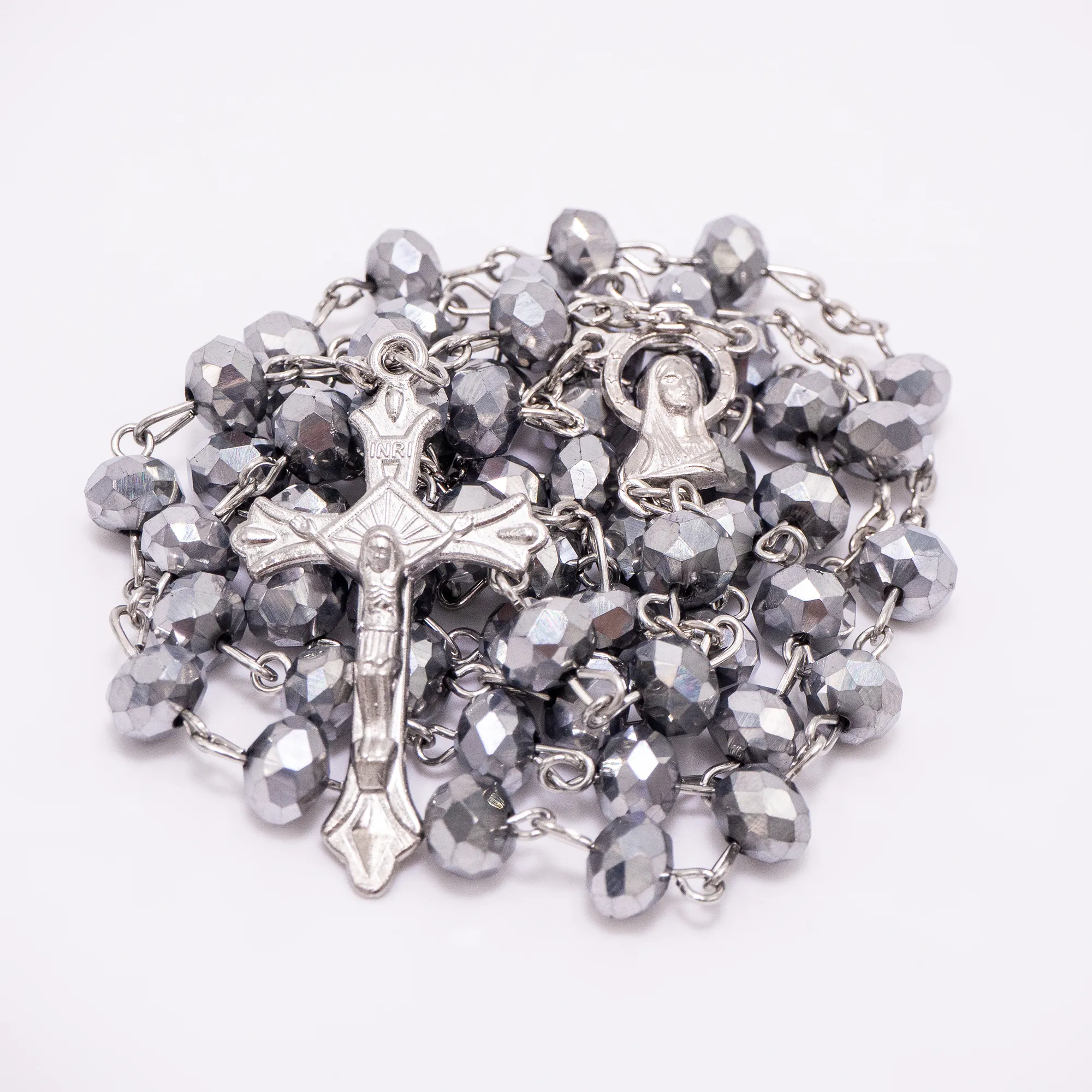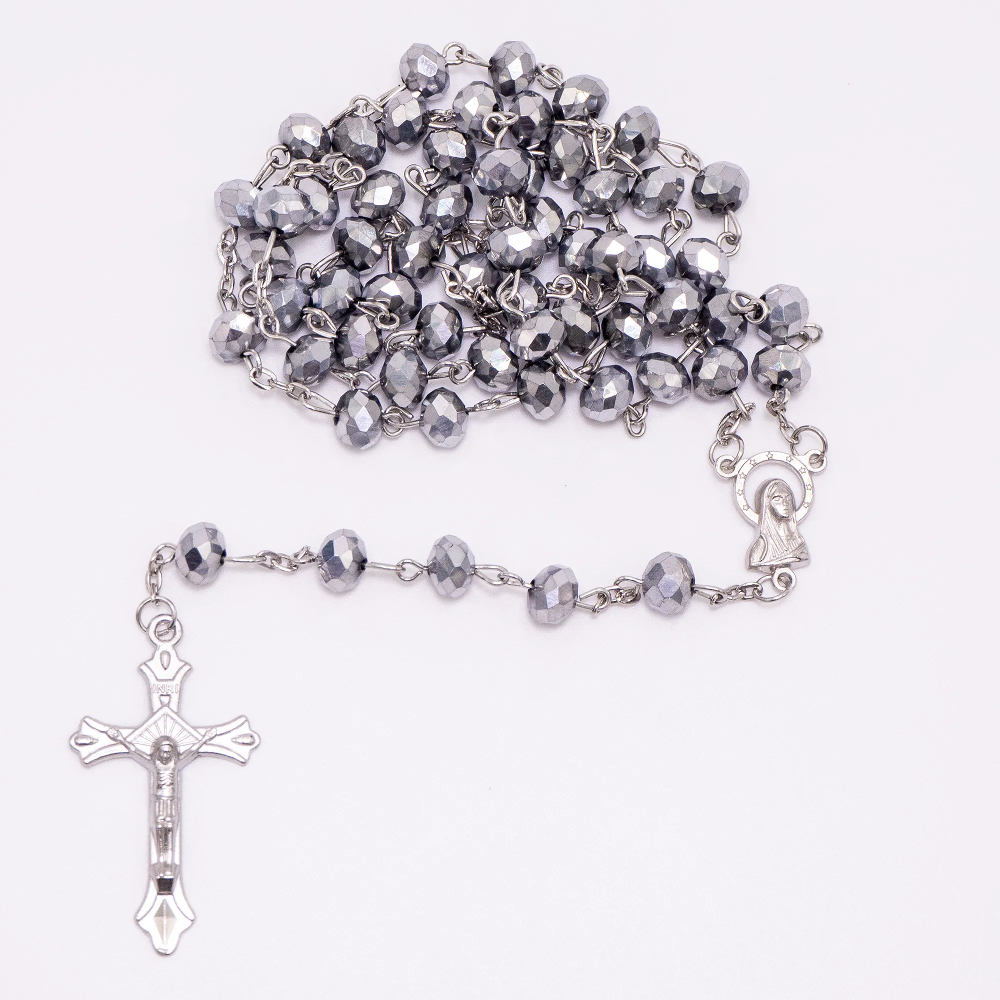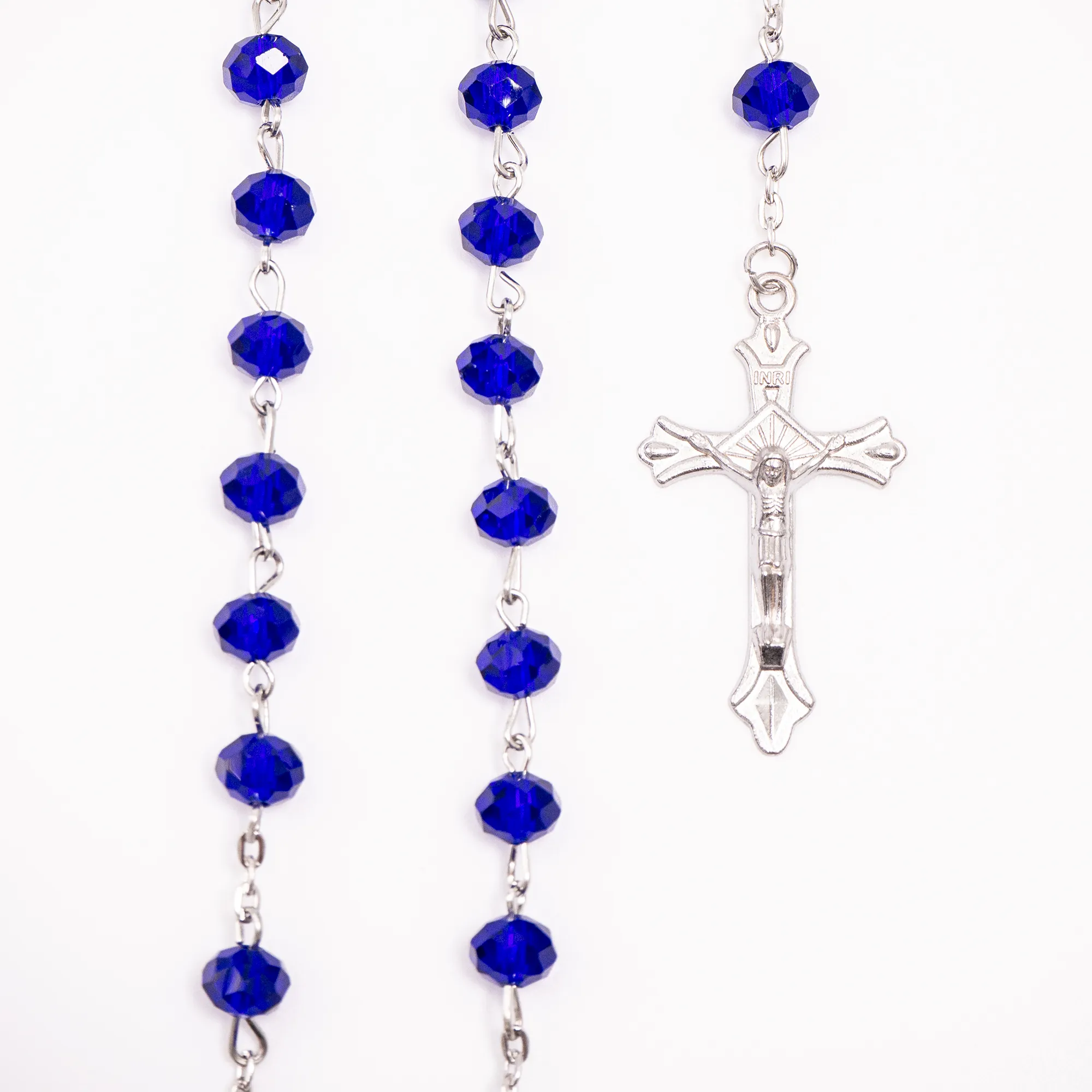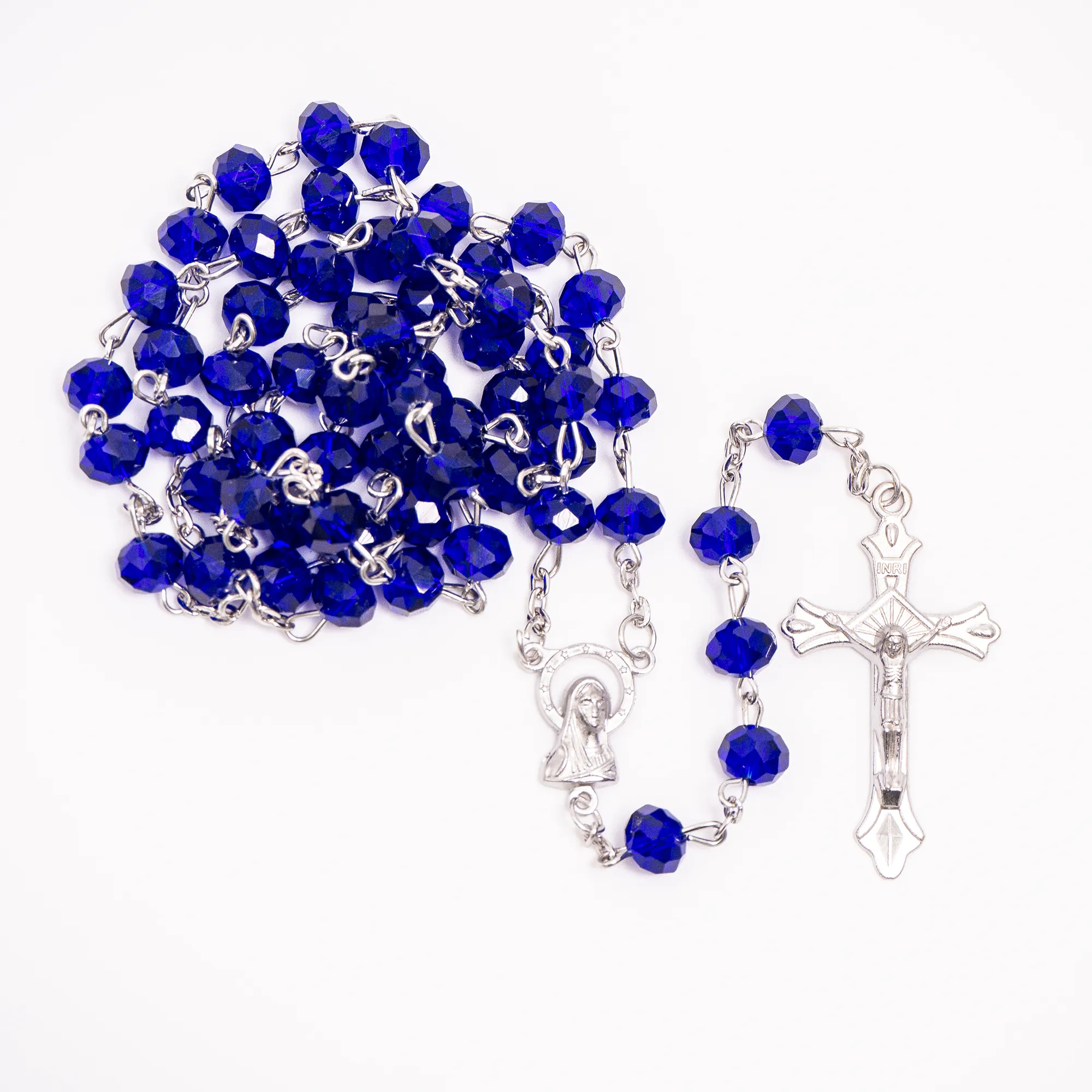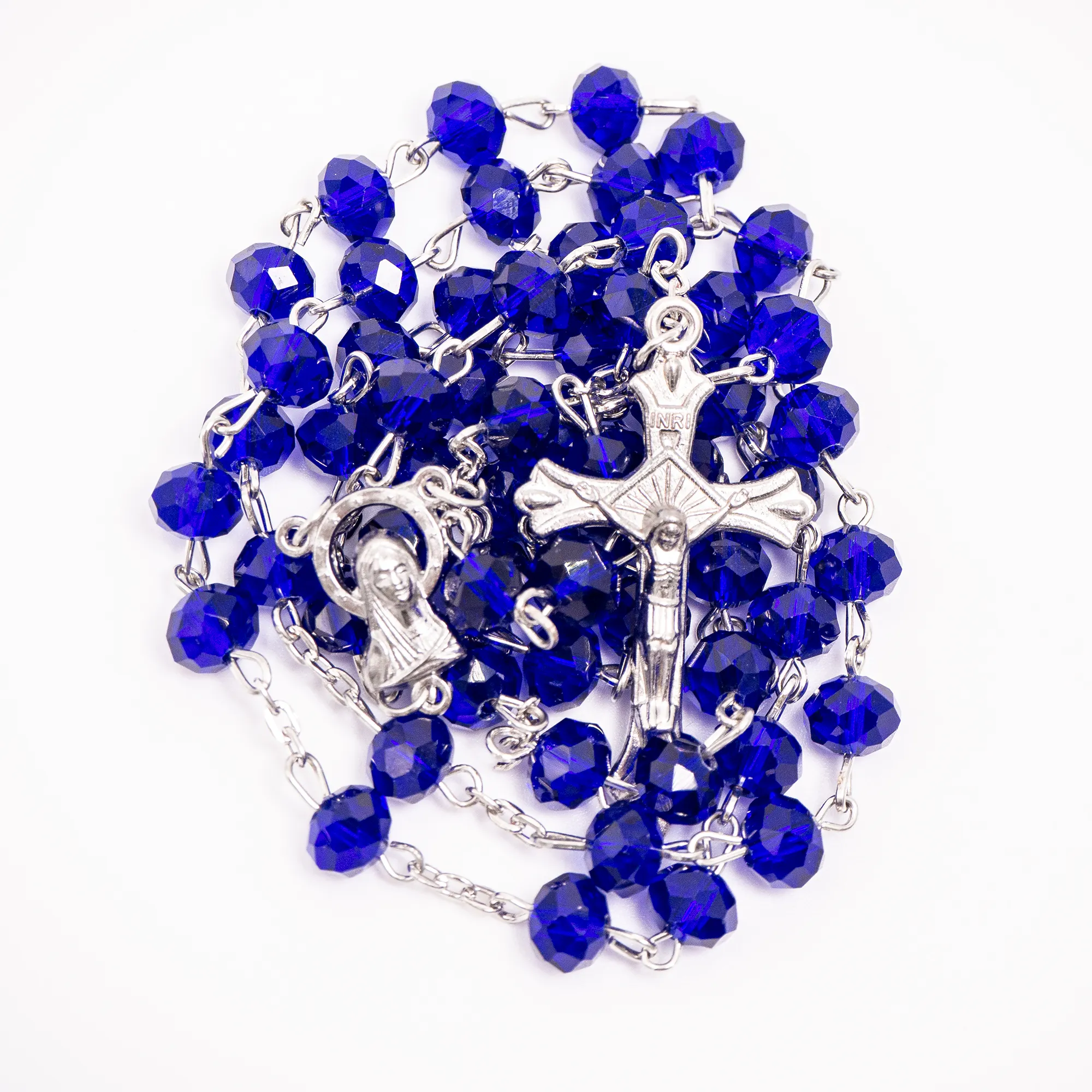Elegancki różaniec z fasetowanych paciorków w kształcie kryształków na srebrnym łańcuszku, z wizerunkiem Matki Bożej i delikatnym krzyżem. Dostępny w intensywnie kobaltowym lub wyrafinowanym srebrnym kolorze.