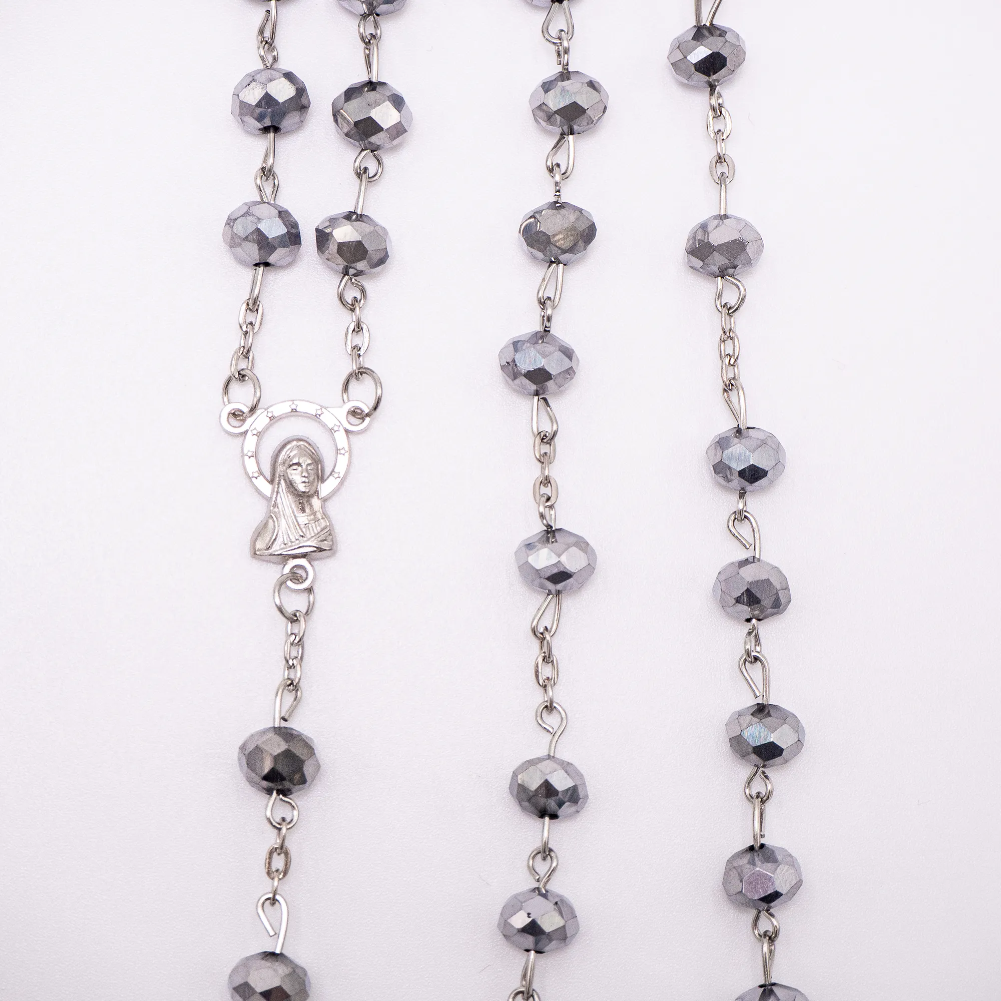 Centralnym elementem różańca jest medalik z wizerunkiem Matki Bożej, wykonany ze szczególną dbałością o detale. Całość wieńczy smukły krzyż, który harmonijnie dopełnia kompozycję.