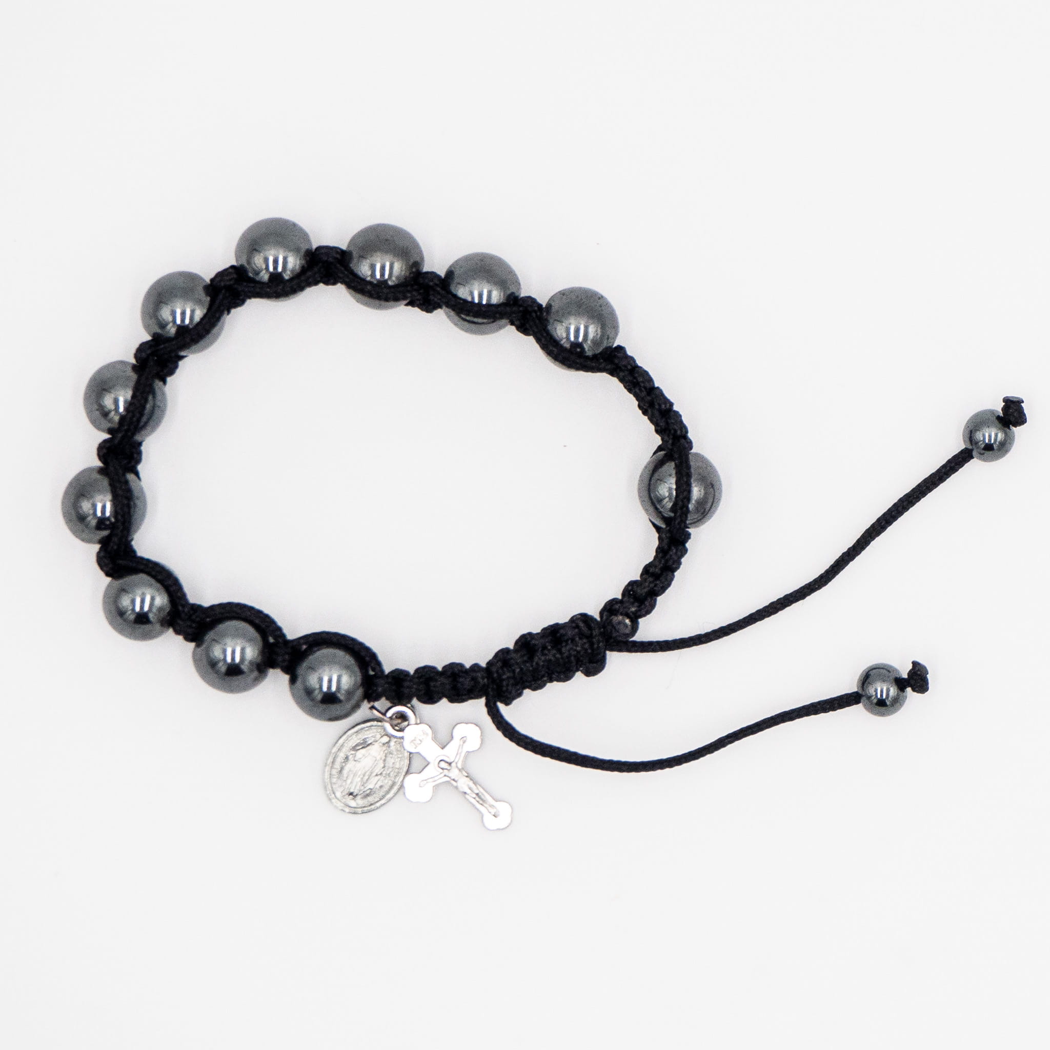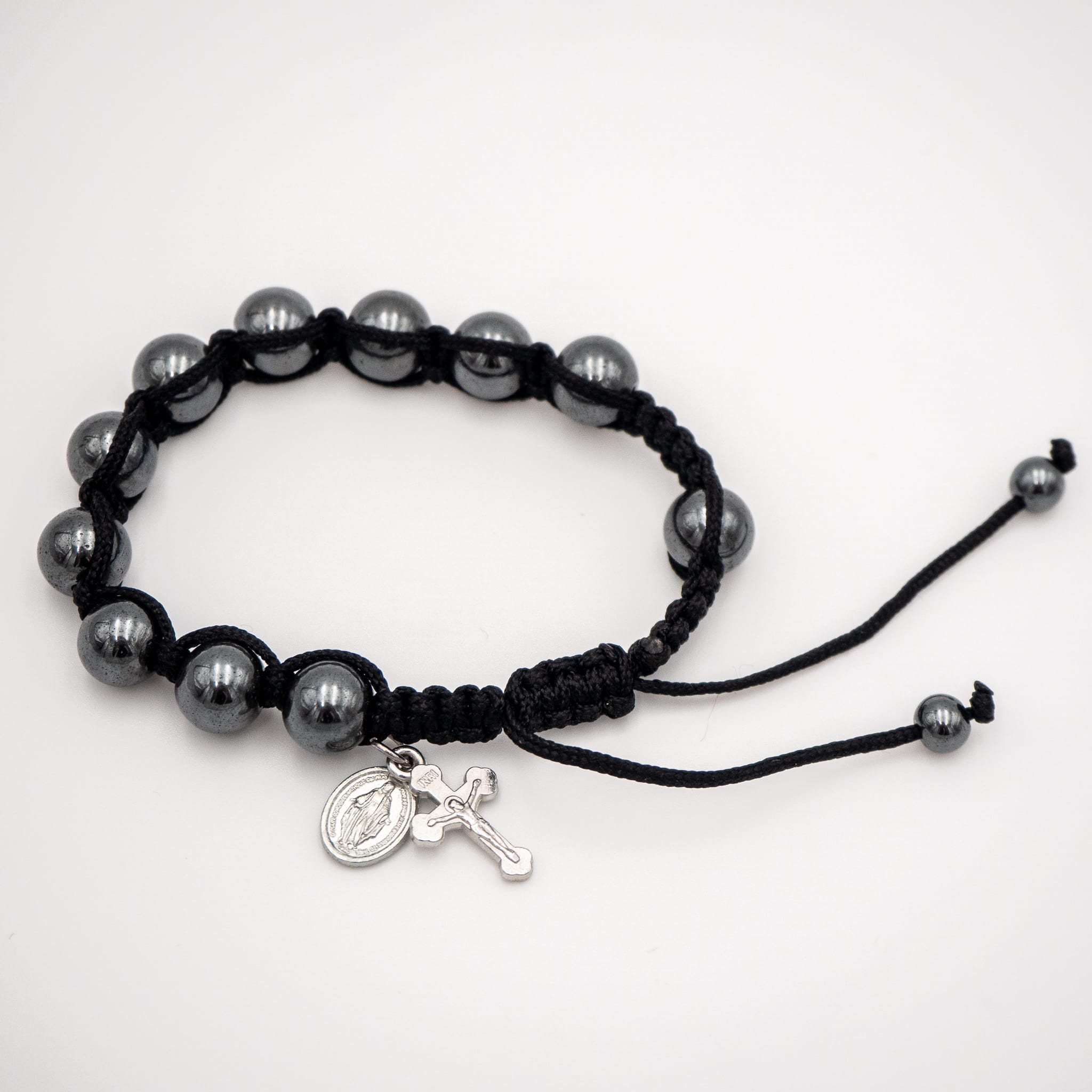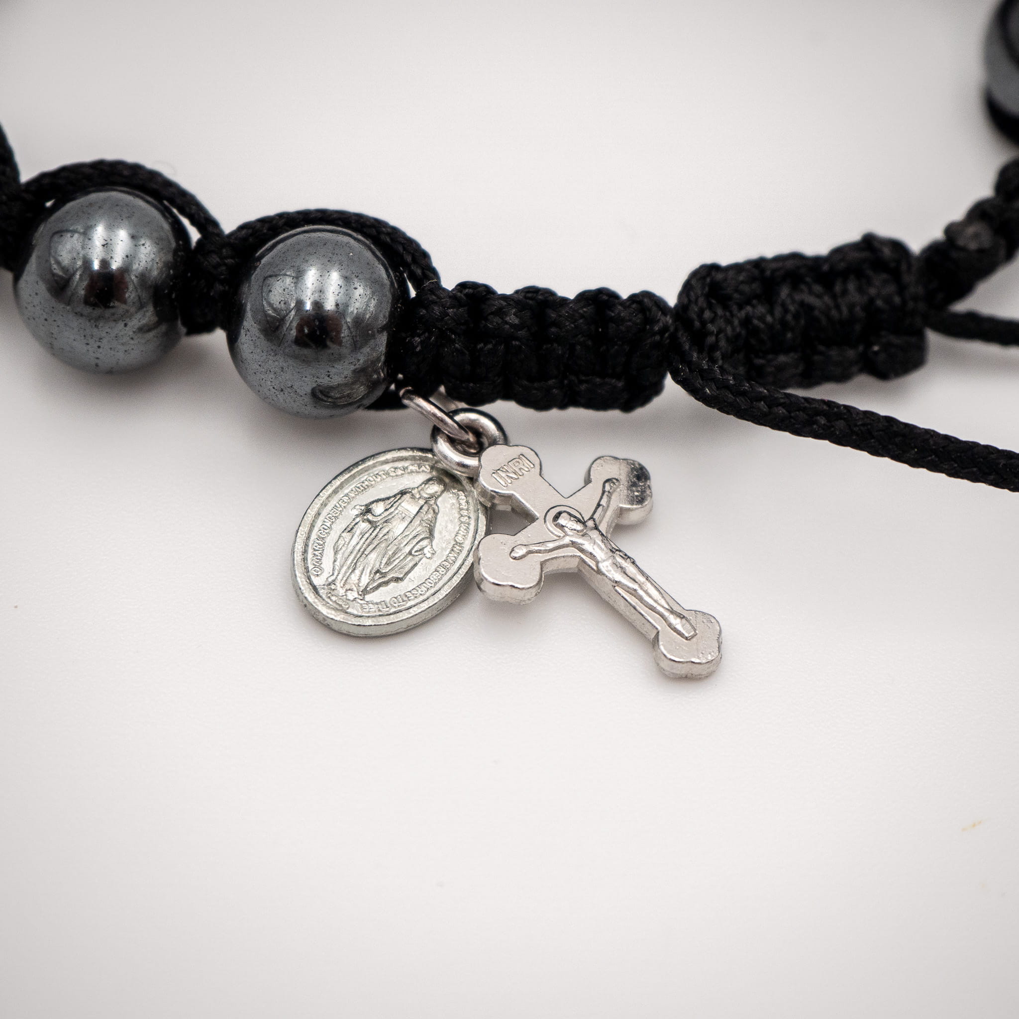 Wytrzymała bransoletka różańcowa z dużymi koralikami z hematytu, regulowanym obwodem, krzyżykiem oraz repliką cudownego medalika. Idealna dla mężczyzn szukających stylowego sposobu na codzienną modlitwę.