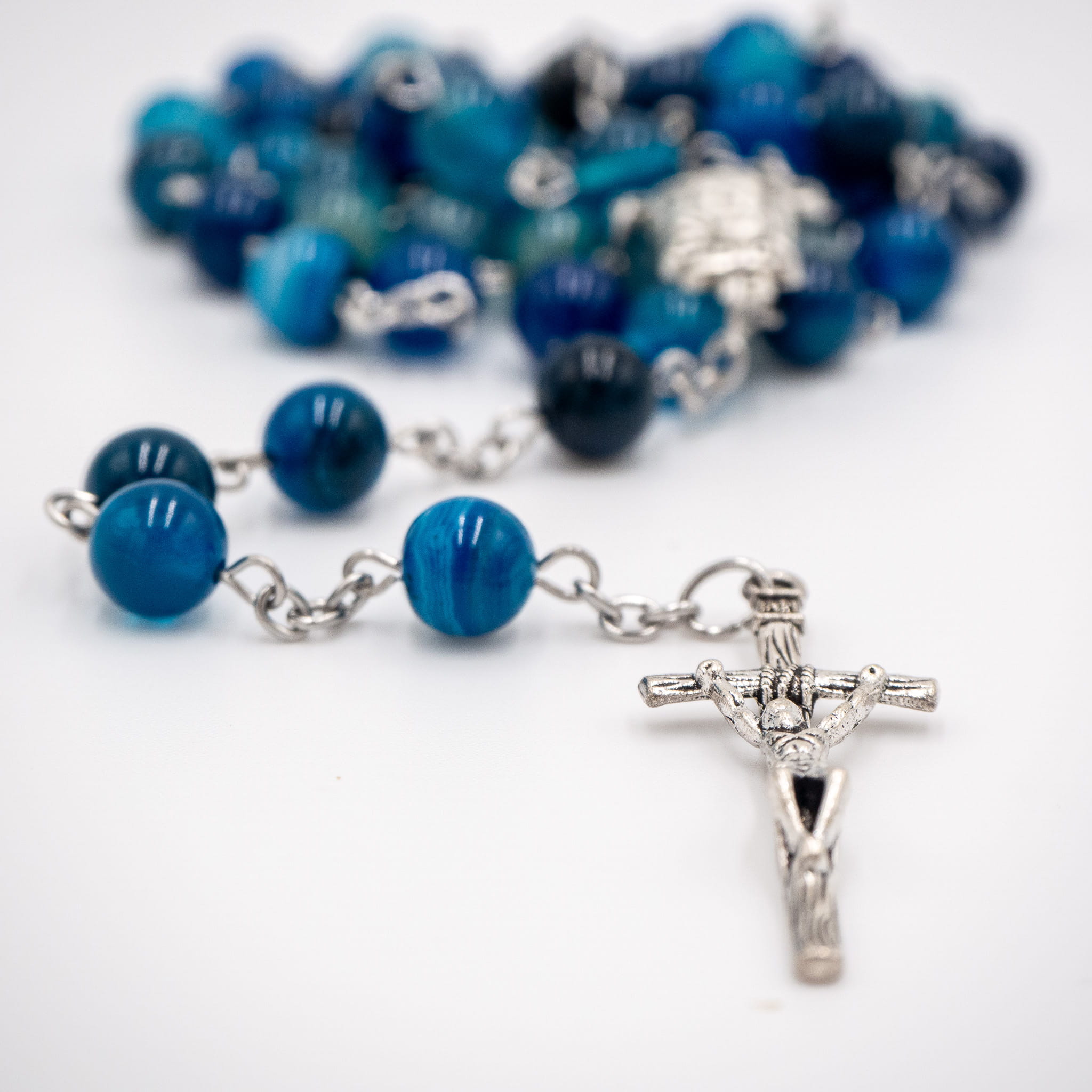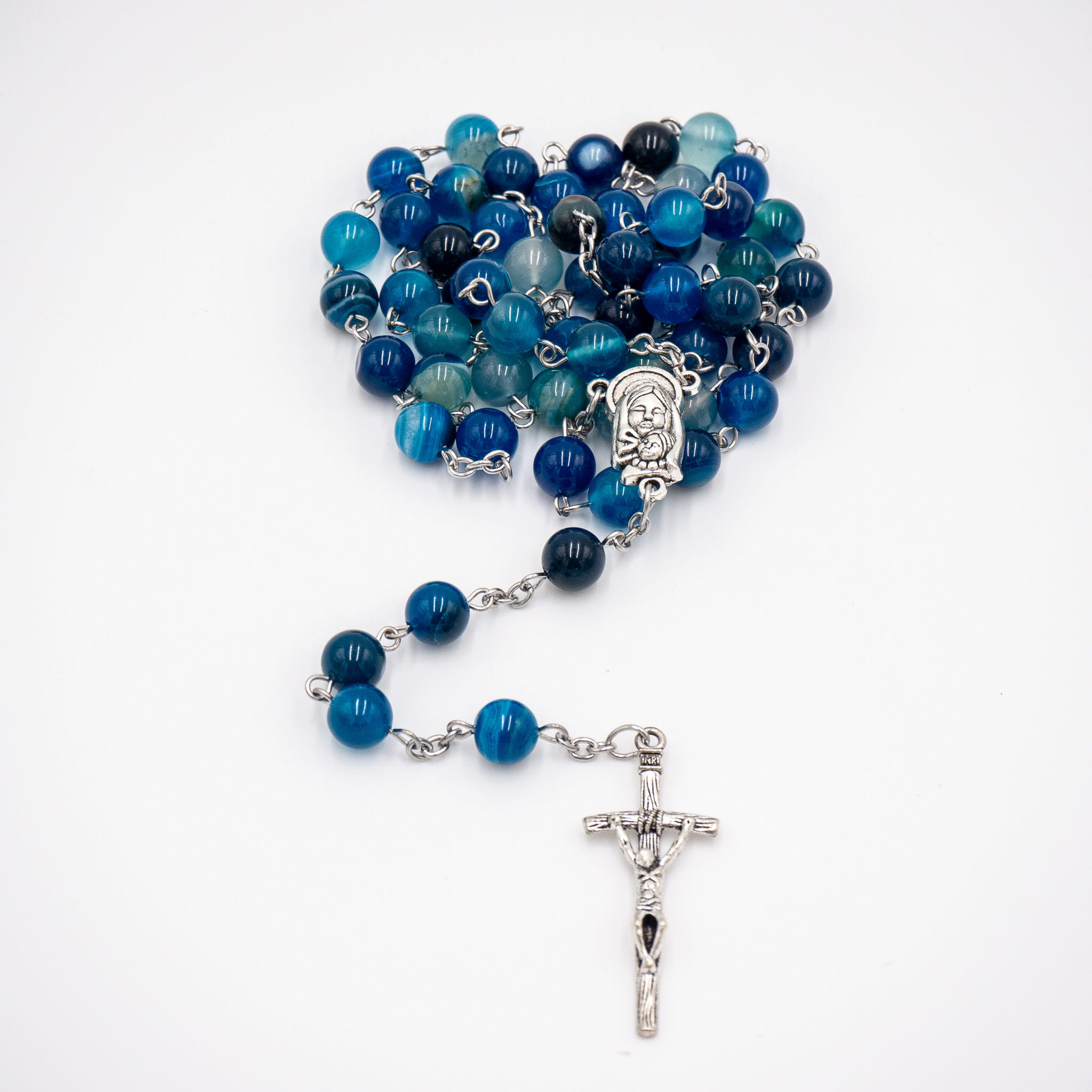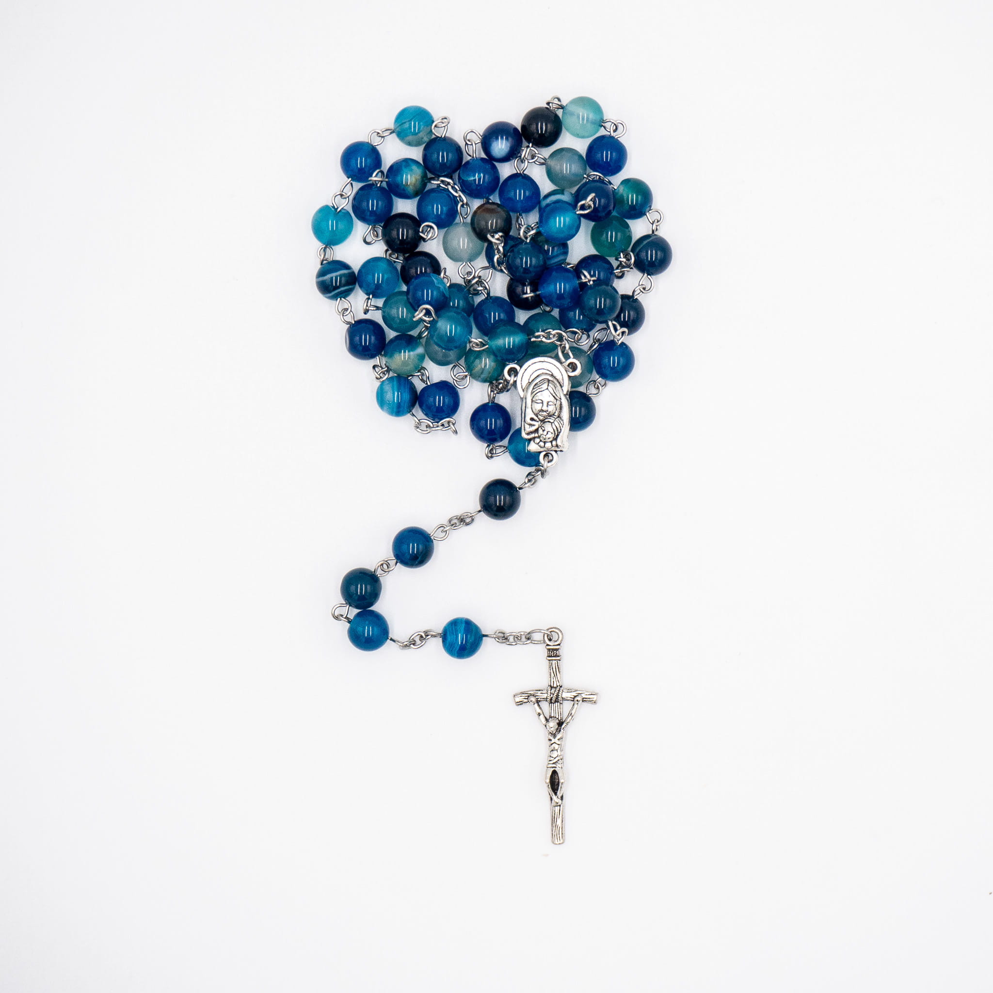 Elegancki, duży różaniec z agatu – idealny dla ceniących naturalne piękno. Unikalne paciorki dodają mu wyjątkowego charakteru, a jednocześnie dają uczucie trwałości i solidności. Dwa kolory do wyboru: niebieski oraz czarny.