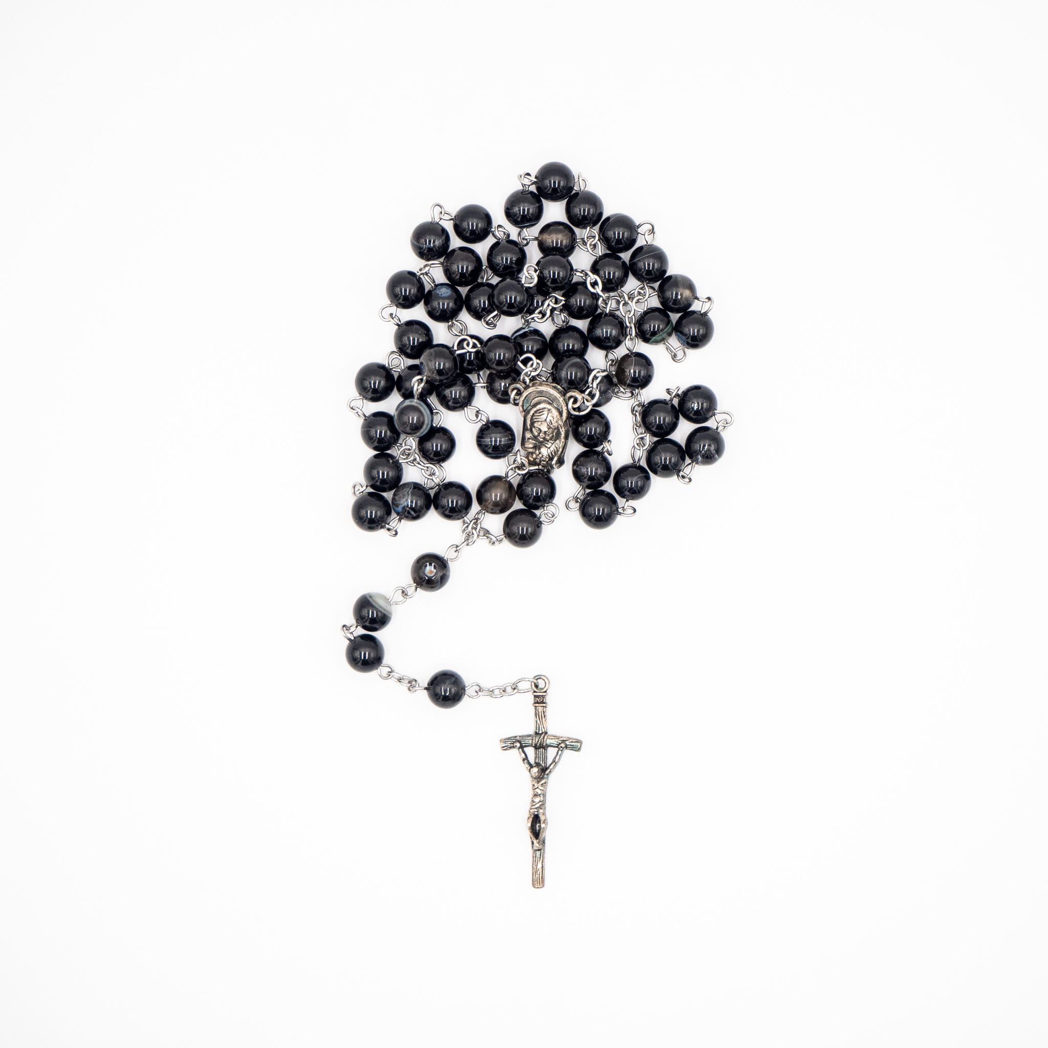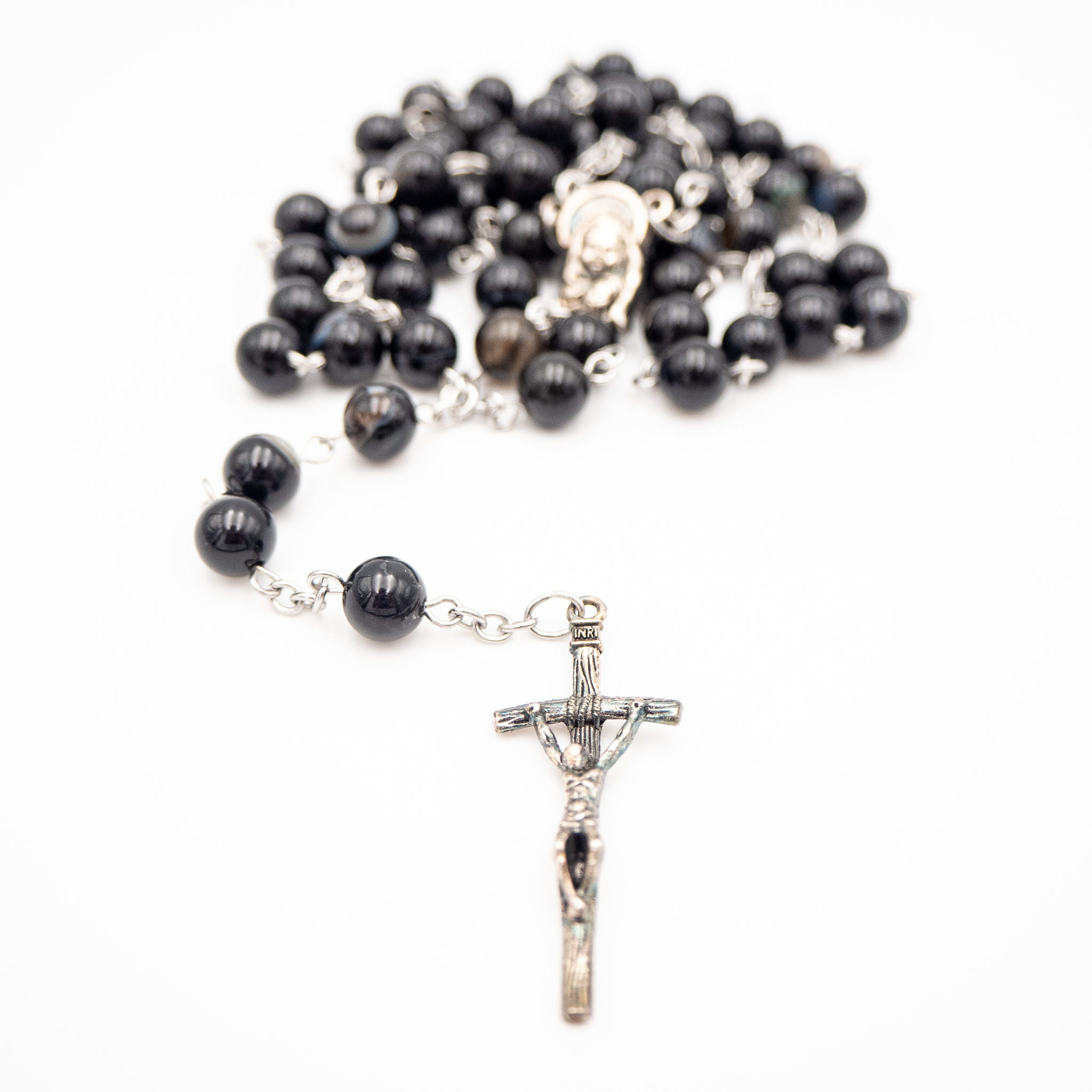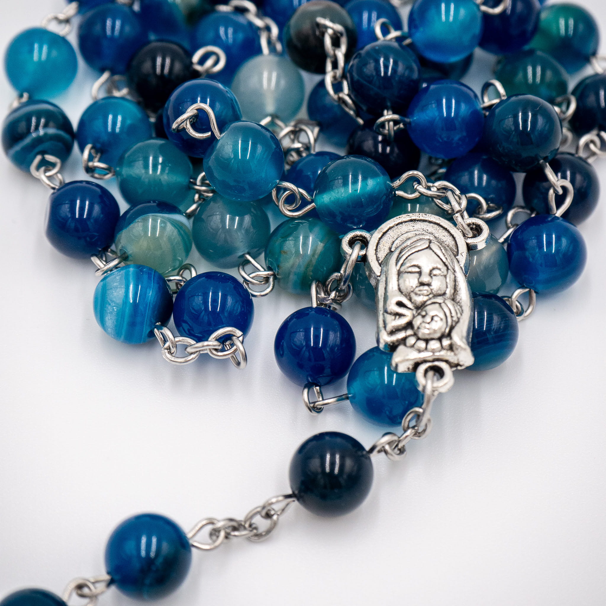 Elegancki, duży różaniec z agatu – idealny dla ceniących naturalne piękno. Unikalne paciorki dodają mu wyjątkowego charakteru, a jednocześnie dają uczucie trwałości i solidności. Dwa kolory do wyboru: niebieski oraz czarny.