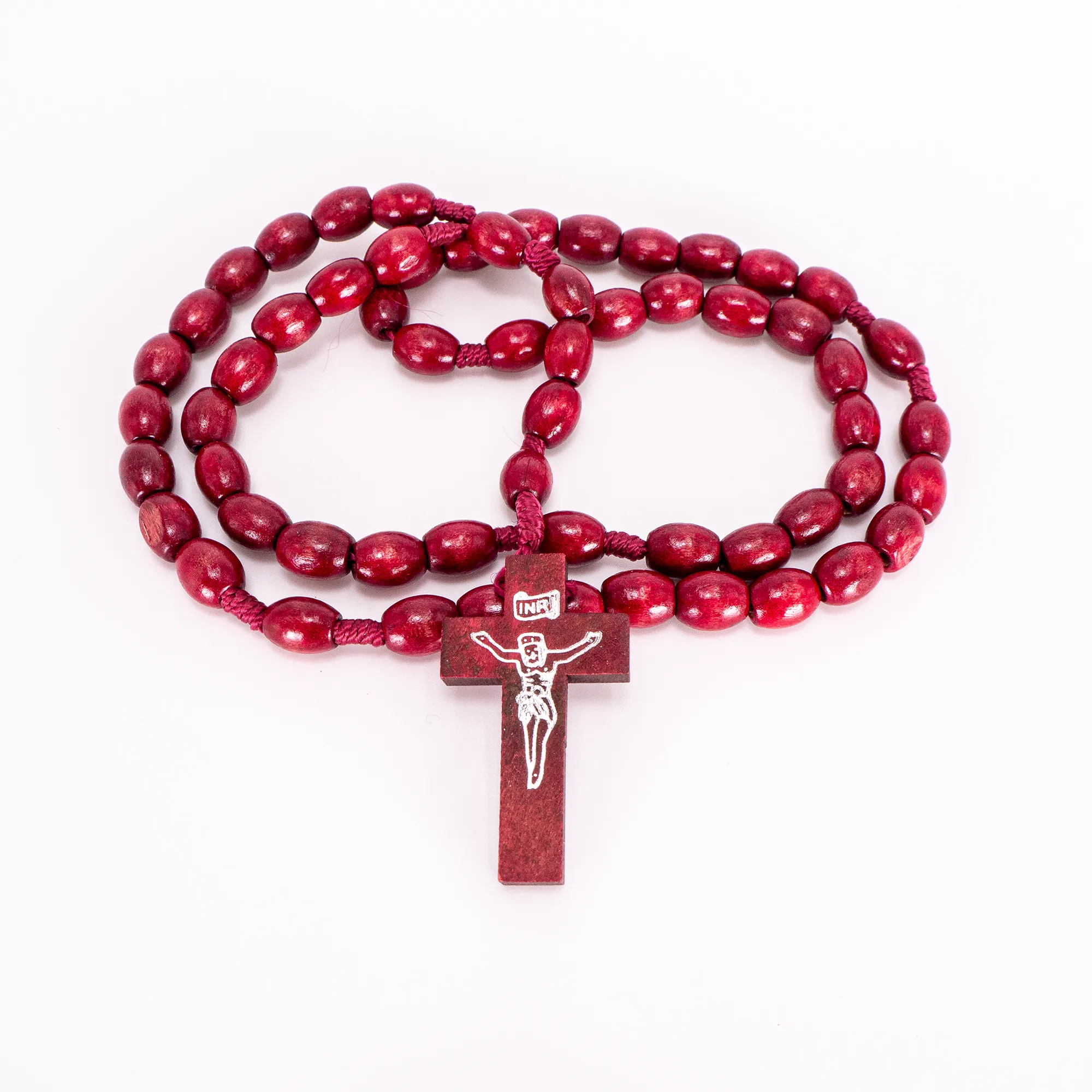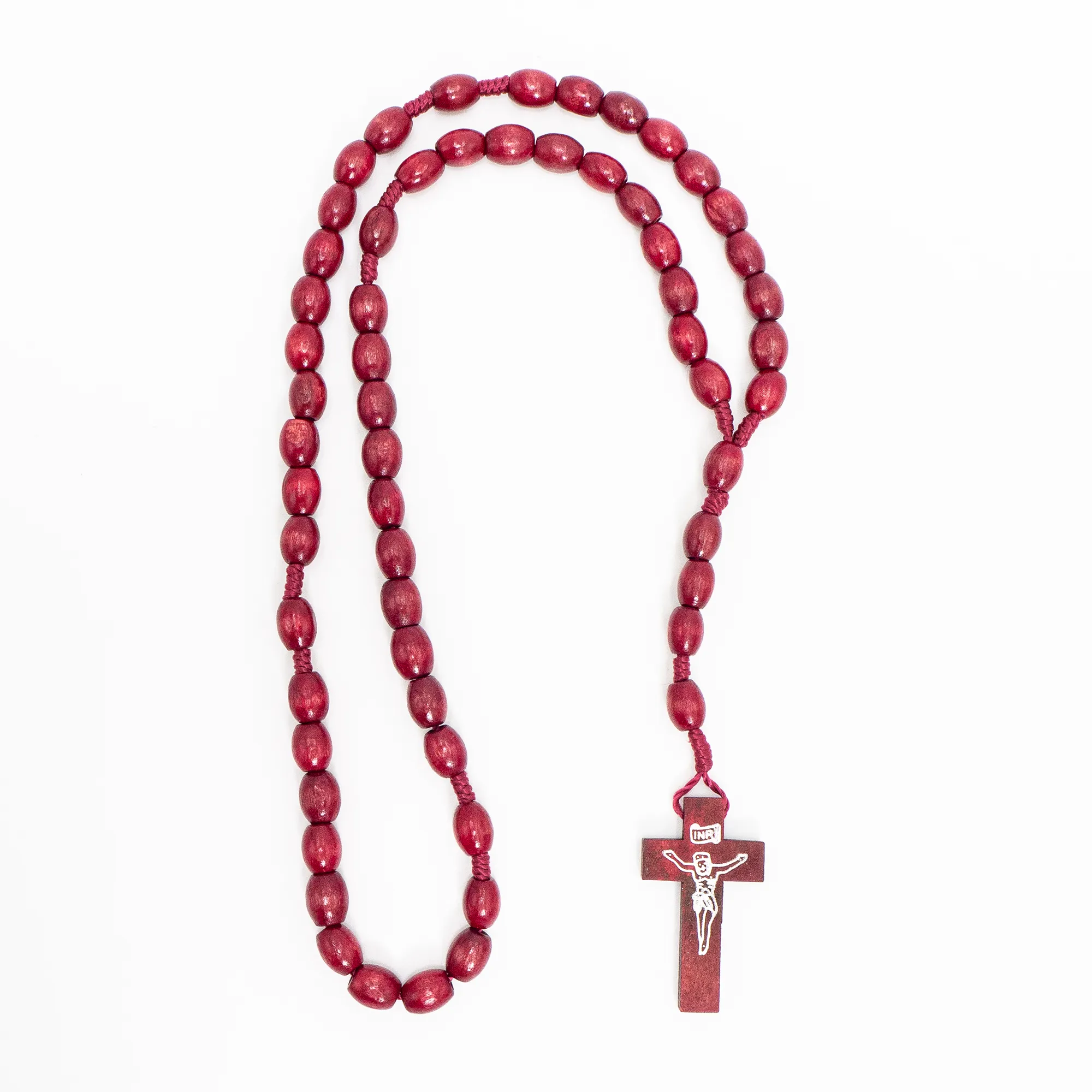 Prosty i wytrzymały różaniec wykonany z owalnych paciorków z drewna w głębokim, ciemnobrązowym lub ciemnobordowym odcieniu.